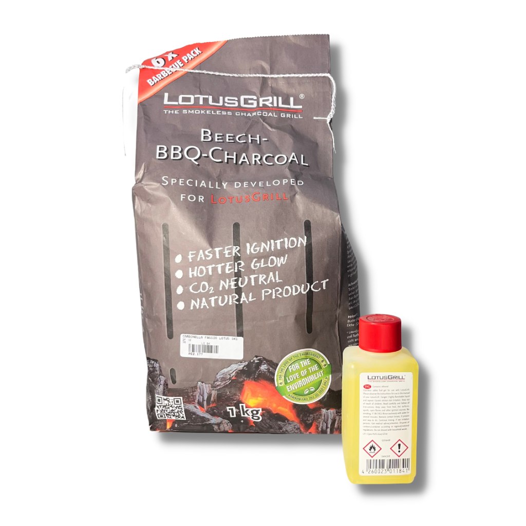 La Gift Box comprende Lotus grill misura standard (€ 189.00), Gel combustibile (€9.90), Carbonella da 1 Kg. (€ 9.80).