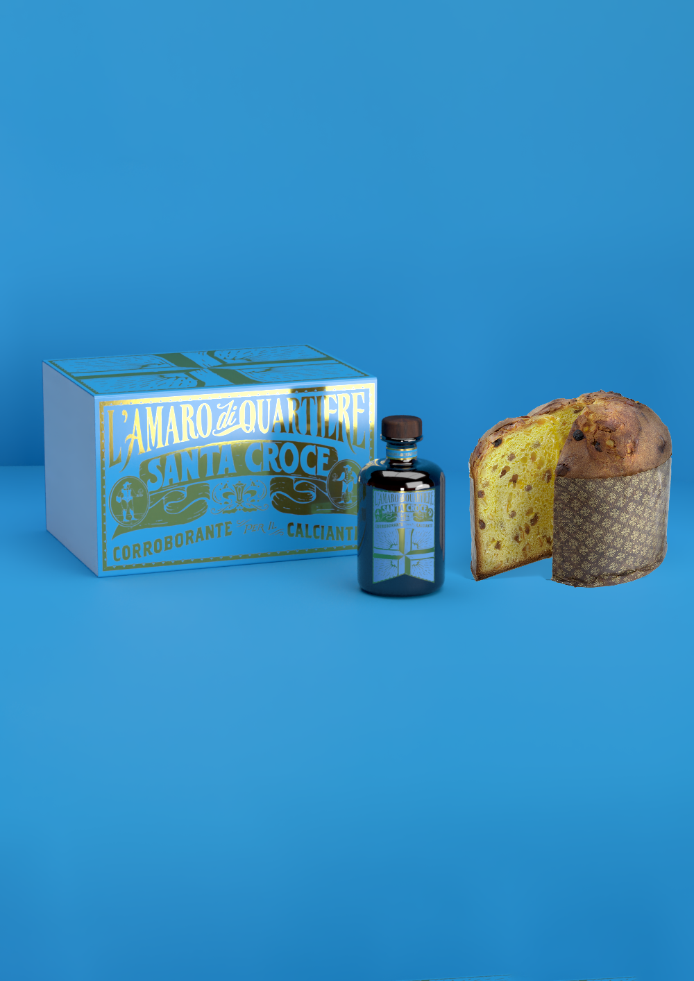 una bottiglia di Amaro di Quartiere Santa Croce e un panettone classico 750 gr.