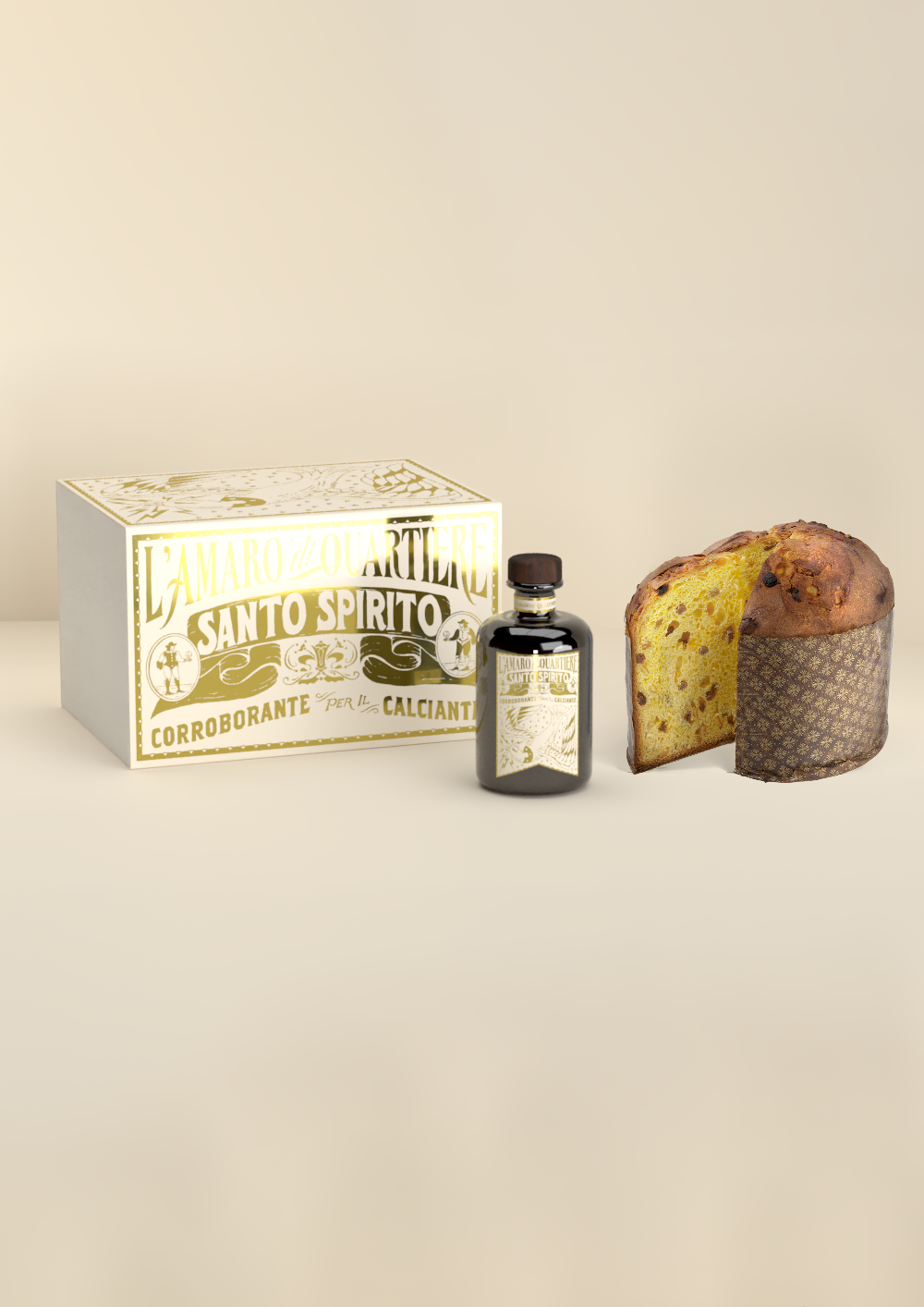 una bottiglia di Amaro di Quartiere Santo Spirito e un panettone classico 750 gr.