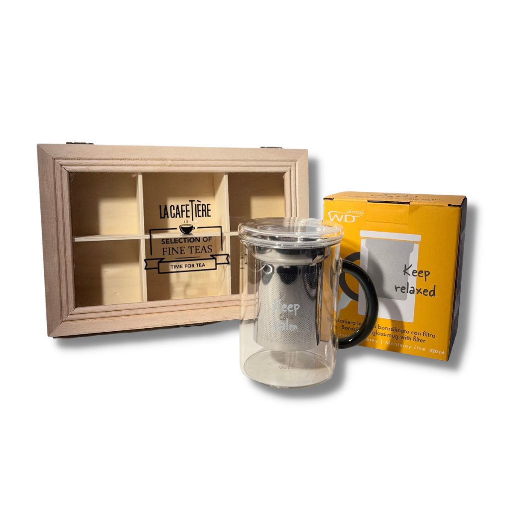 Gift box composta da un contenitore per bustine di te con sei scomparti e tisaniera in vetro borosilicato con filtro.