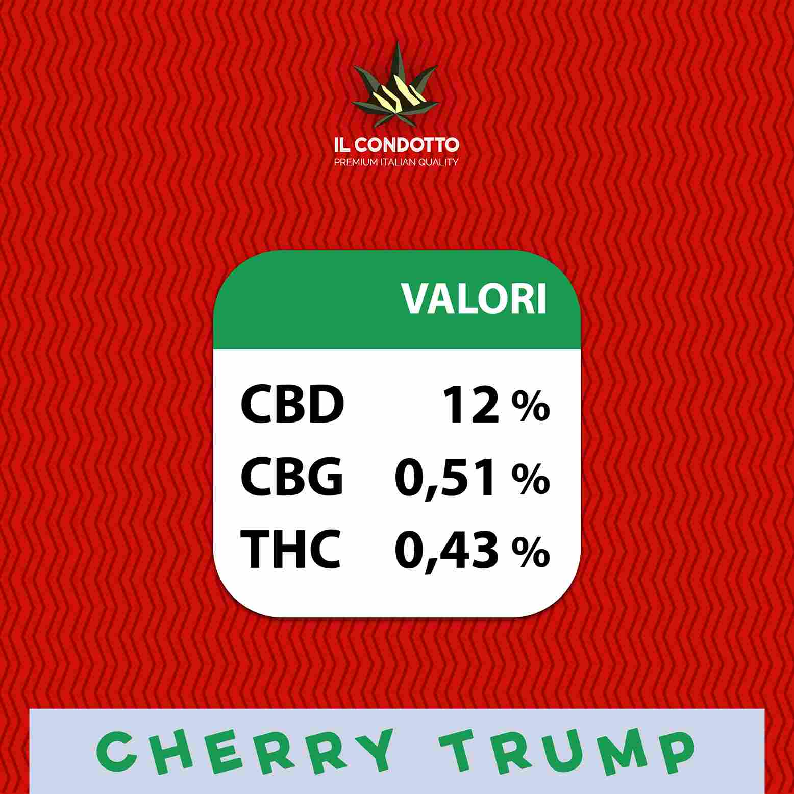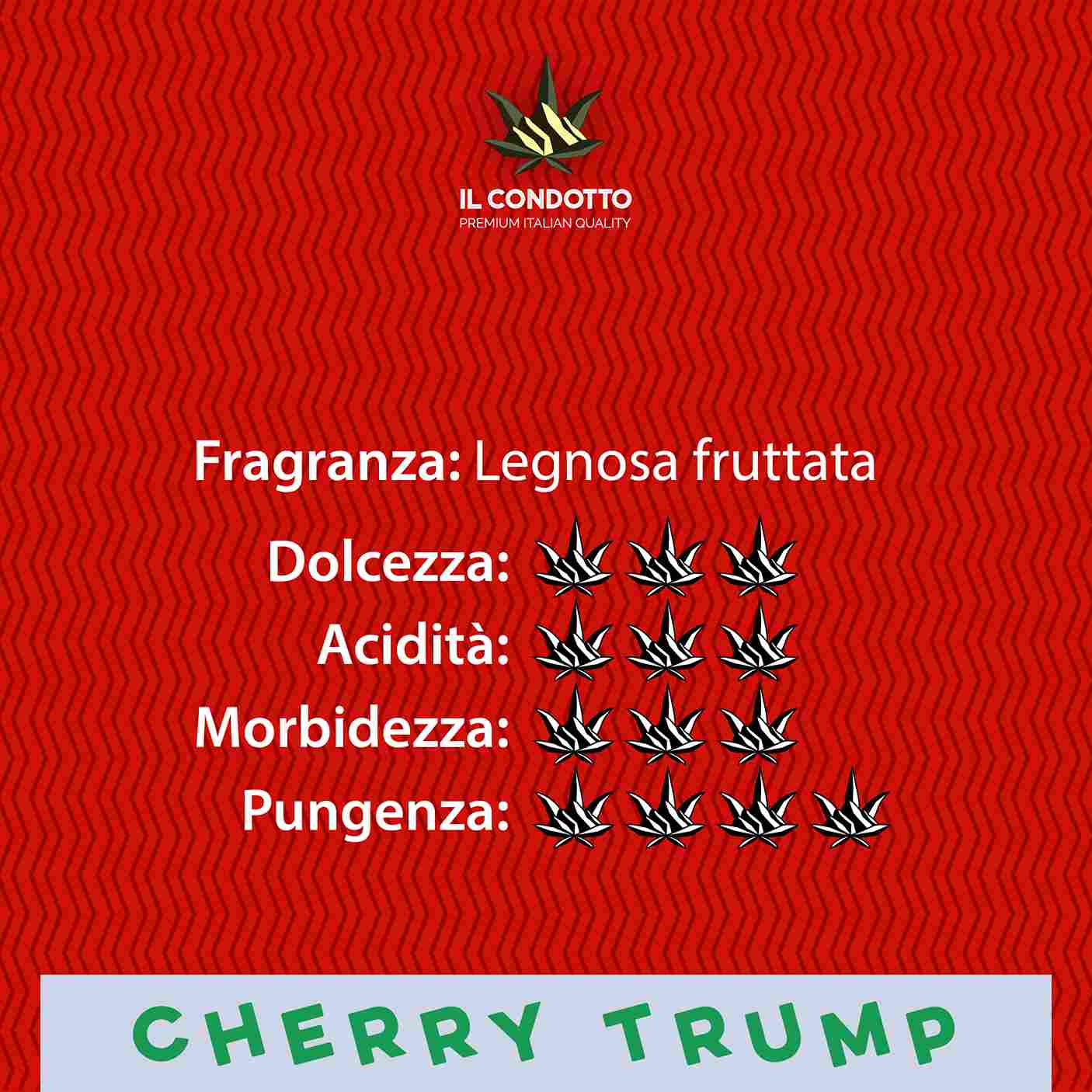 Cherry Trump è un’infiorescenza dai fiori grossi e arrotondati. Si riconosce all’olfatto per la sua dolcezza particolare che richiama le caramelle alla frutta mentre al palato per le note calde del legno giovane, come il ciliegio.
