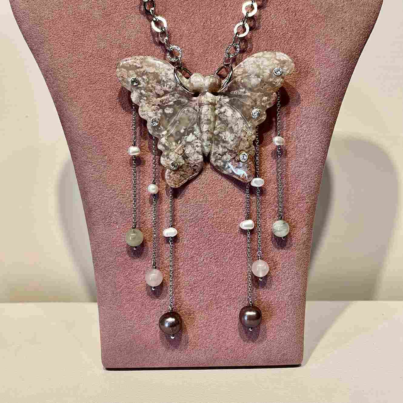 Pezzo unico. Collana Farfalla, Diaspro, Perle & Quarzo Rosa Argento 925 – gr 20.20