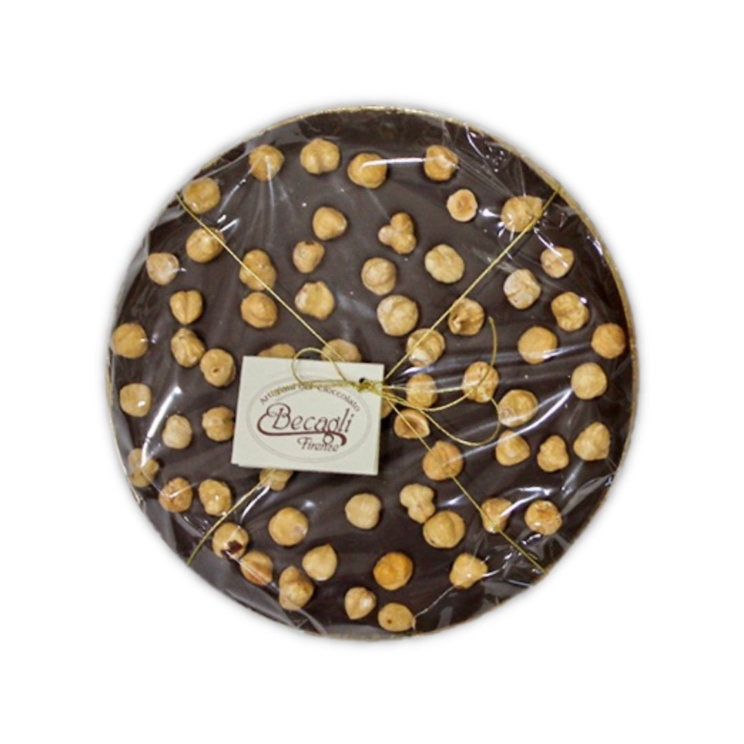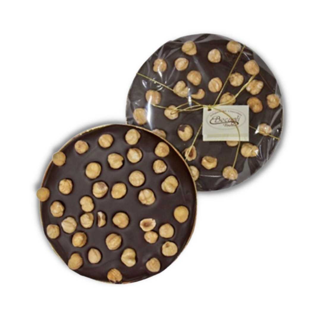 - Nocciolato tondo sottile di fine cioccolato fondente 52% con nocciole intere Piemonte in confezione regalo, diametro 22cm.